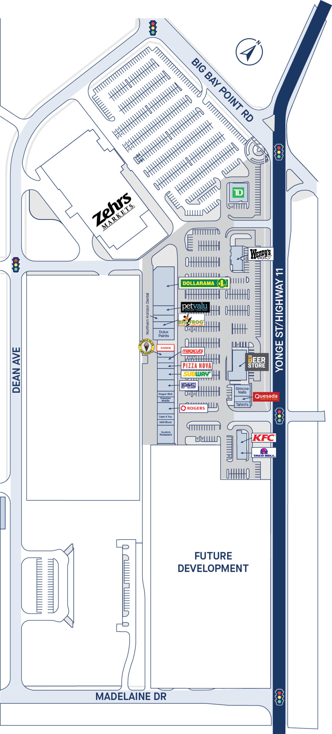 Located at the south-west corner of Yonge Street and Big Bay Point Road in Barrie, this site is shadow-anchored by a Zehrs Markets Supermarket and the LCBO, and anchored by TD Bank, Wendy's, Dollarama, Rogers, The Beer Store and Pet Valu. Heritage Square is a high-traffic, high-visibility site, only a few minutes from the Barrie South GO Train station. Intensification is occurring in this busy node, with thousands of new residential units under construction in the area. Heritage Square also has schools, parks and a library nearby. The next phase of this centre will include retail and mixed-use development.